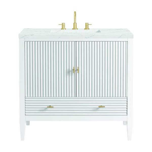 The 36'' Myrrin Single Vanity features a minimalistic silhouette with fluted details, resulting in a blend of classical elegance and contemporary design. The deeply fluted panels run perpendicular on the doors and drawers, adding sophistication and visual interest to the design. Toggle-style knobs in Champagne Brass provide a luxe accent to the rich Bright White finish. The two-door cabinet opens to a spacious interior with a single shelf and a convenient USB/Electric power outlet. A single, lower-level drawer lends additional storage.