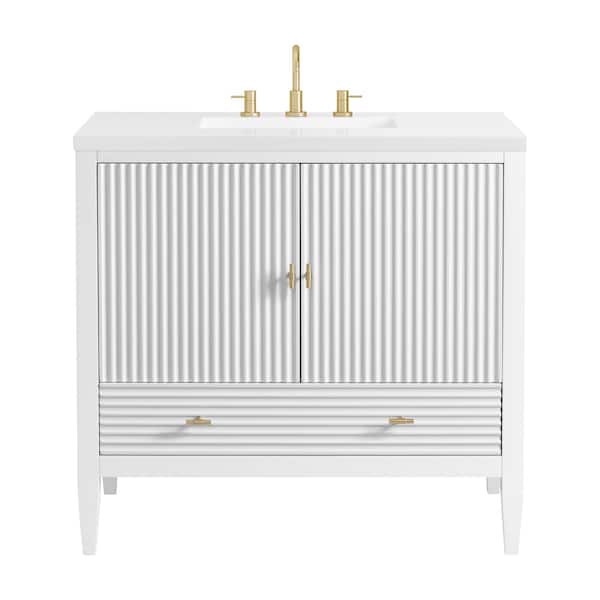The 36'' Myrrin Single Vanity features a minimalistic silhouette with fluted details, resulting in a blend of classical elegance and contemporary design. The deeply fluted panels run perpendicular on the doors and drawers, adding sophistication and visual interest to the design. Toggle-style knobs in Champagne Brass provide a luxe accent to the rich Bright White finish. The two-door cabinet opens to a spacious interior with a single shelf and a convenient USB/Electric power outlet. A single, lower-level drawer lends additional storage. With the addition of a classic White Zeus Silestone top and undermount sink, this vanity is a seamless integration of modern design and functionality.