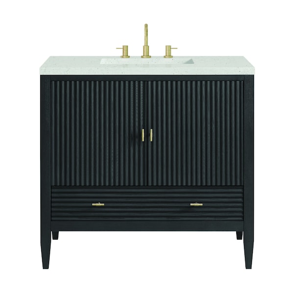 The 36'' Myrrin Single Vanity features a minimalistic silhouette with fluted details, resulting in a blend of classical elegance and contemporary design. The deeply fluted panels run perpendicular on the doors and drawers, adding sophistication and visual interest to the design. Toggle-style knobs in Champagne Brass provide a luxe accent to the sophisticated Carbon Oak finish. The two-door cabinet opens to a spacious interior with a single shelf and a convenient USB/Electric power outlet. A single, lower-level drawer lends additional storage. The Lime Delight Quartz top lends warm, textured beige tones to perfectly complement the finish on the vanity.