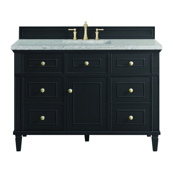 The 48'' Lorelai Single Vanity celebrates timeless form and exquisite finish details, combined with practical function. The rich Black Onyx finish is accented by coin-edge knobs in Champagne Brass which provides an sophisticated contrast. Reeded details, and clean, and raised picture frame molding lend visual interest. This single-door cabinet opens to a spacious interior with a single shelf and a convenient USB/Electric power outlet. Six drawers plus one tip-out drawer offer additional storage space. Completing the look is the Eternal Jasmine Pearl quartz top by Silestone, featuring an elegant white background with subtle marbleized swirls and dark Bleu-gray veining patterns.
