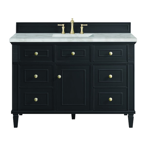 The 48'' Lorelai Single Vanity celebrates timeless form and exquisite finish details, combined with practical function. The rich Black Onyx finish is accented by coin-edge knobs in Champagne Brass which provides an sophisticated contrast. Reeded details, and clean, and raised picture frame molding lend visual interest. This single-door cabinet opens to a spacious interior with a single shelf and a convenient USB/Electric power outlet. Six drawers plus one tip-out drawer offer additional storage space. The finish is accented by the neutral background of the Victorian Silver Quartz top, boasting champagne metallic accents which seamlessly complete the look.