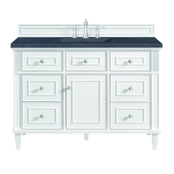 The 48'' Lorelai Single Vanity celebrates timeless form and exquisite finish details, combined with practical function. The sophisticated Bright White finish is accented by reeded details, and clean, raised picture frame molding. Coin-edge knobs in Satin Nickel provide the perfect accent. This single-door cabinet opens to a spacious interior with a single shelf and a convenient USB/Electric power outlet. Six drawers plus one tip-out drawer offer additional storage space. Completing this piece is a distinguished top, characterized by depth and a sense of movement with a suede finish. The Charcoal Soapstone Quartz top is a timeless statement to complete the look of your vanity.