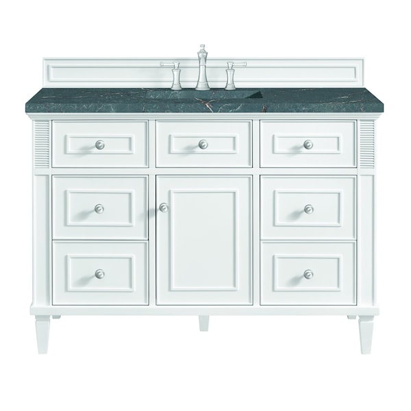 The 48'' Lorelai Single Vanity celebrates timeless form and exquisite finish details, combined with practical function. The sophisticated Bright White finish is accented by reeded details, and clean, raised picture frame molding. Coin-edge knobs in Satin Nickel provide the perfect accent. This single-door cabinet opens to a spacious interior with a single shelf and a convenient USB/Electric power outlet. Six drawers plus one tip-out drawer offer additional storage space. The finish and hardware accents are enhanced by the Parisien Blue Quartz top, offering a deep bluish hue with broad and intricate neutral veins highlighted by fine coppery accents.