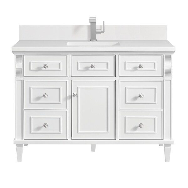 48'' Single Vanity, Bright White w/ Single Hole 3 CM White Zeus Quartz Top & Backsplash