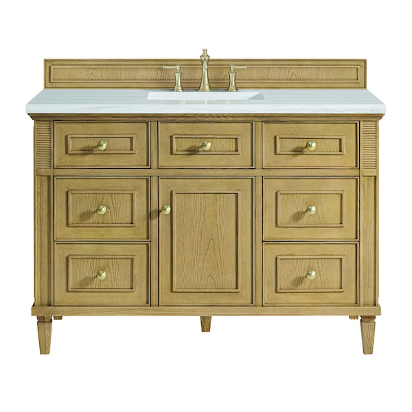 The 48'' Lorelai Single Vanity celebrates timeless form and exquisite finish details, combined with practical function. The Light Natural Oak finish is accented by reeded details, and clean, raised picture frame molding. Coin-edge knobs in Champagne Brass provide the perfect accent. This single-door cabinet opens to a spacious interior with a single shelf and a convenient USB/Electric power outlet. Six drawers plus one tip-out drawer offer additional storage space. Completing this beautiful vanity is a 3cm solid surface Arctic Fall vanity top, which displays horizontal grey veining, giving you the look of classic marble with the benefits of modern technology.