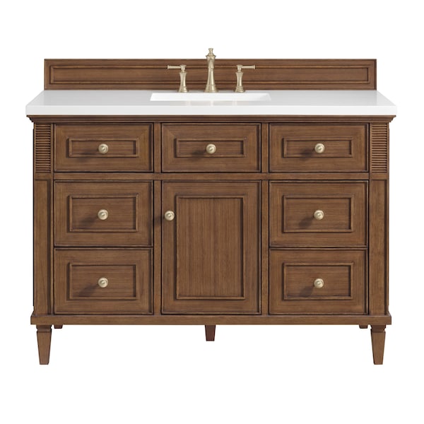The 48'' Lorelai Single Vanity celebrates timeless form and exquisite finish details, combined with practical function. The beauty of the natural grains in the walnut veneer is accented by reeded details, and clean, raised picture frame molding. The decorative, coin-edge knobs in Champagne Brass provide the perfect complement to the Mid-Century Walnut finish. This single-door cabinet opens to a spacious interior with a single shelf and a convenient USB/Electric power outlet. Six drawers plus one tip-out drawer offer additional storage space. Choose one of our tops with undermount, rectangular sinks to perfectly complete this masterpiece.