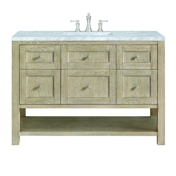 The 48'' Breckenridge Vanity in Whitewashed Oak by James Martin Vanities brings an fresh new style with classic features to your bathroom. The single faux-drawer style door opens to an interior shelf, with convenient access to a built-in USB/electric outlet. Four drawers and a removable bamboo storage tray provide organization. The lower, integrated shelf provides extra storage for towels and decor. Completing this vanity, are the treasured, neutral tones and textures of the Carrara marble vanity top display an white background with delicate grey veining.