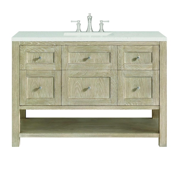 The 48'' Breckenridge Vanity in Whitewashed Oak by James Martin Vanities brings an fresh new style with classic features to your bathroom. The single faux-drawer style door opens to an interior shelf, with convenient access to a built-in USB/electric outlet. Four drawers and a removable bamboo storage tray provide organization. The lower, integrated shelf provides extra storage for towels and decor. The Lime Delight quartz top by Sielstone lends warm, textured beige tones to perfectly complement the finish on the vanity.
