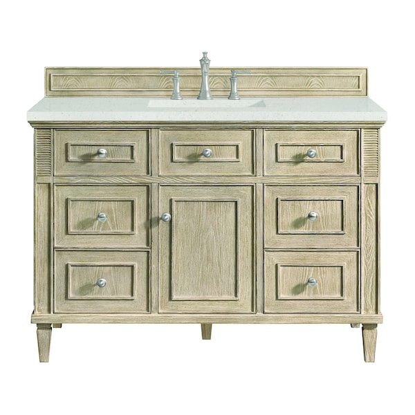 The 48'' Lorelai Single Vanity celebrates timeless form and exquisite finish details, combined with practical function. The Whitewashed Oak finish is accented by reeded details, and clean, raised picture frame molding. Coin-edge knobs in Satin Nickel provide the perfect accent. This single-door cabinet opens to a spacious interior with a single shelf and a convenient USB/Electric power outlet. Six drawers plus one tip-out drawer offer additional storage space. The Lime Delight Quartz top lends warm, textured beige tones to perfectly complement the finish on the vanity.