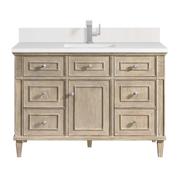 48'' Single Vanity, Whitewashed Oak w/ Single Hole 3 CM White Zeus Quartz Top & Backsplash