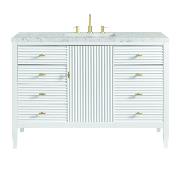 The 48'' Myrrin Single Vanity features a minimalistic silhouette with fluted details, resulting in a blend of classical elegance and contemporary design. The deeply fluted panels run perpendicular on the doors and drawers, adding sophistication and visual interest to the design. Toggle-style knobs in Champagne Brass provide a luxe accent to the rich Bright White finish. The single-door cabinet opens to a spacious interior with a single shelf and a convenient USB/Electric power outlet. Six drawers lend additional storage. Completing the look is the Eternal Jasmine Pearl quartz top by Silestone, featuring an elegant white background with subtle marbleized swirls and dark blue-gray veining patterns.