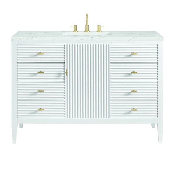 The 48'' Myrrin Single Vanity features a minimalistic silhouette with fluted details, resulting in a blend of classical elegance and contemporary design. The deeply fluted panels run perpendicular on the doors and drawers, adding sophistication and visual interest to the design. Toggle-style knobs in Champagne Brass provide a luxe accent to the rich Bright White finish. The single-door cabinet opens to a spacious interior with a single shelf and a convenient USB/Electric power outlet. Six drawers lend additional storage. The addition of an Ethereal Noctis quartz top by Silestone with undermount rectangular sink completes this timeless bathroom centerpiece with its modern, intricate black and gray nuances which add contrast and elegance to the white background.
