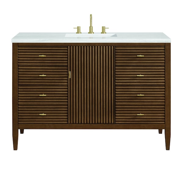 The 48'' Myrrin Single Vanity features a minimalistic silhouette with fluted details, resulting in a blend of classical elegance and contemporary design. The deeply fluted panels run perpendicular on the doors and drawers, adding sophistication and visual interest to the design. Toggle-style knobs in Champagne Brass provide a luxe accent to the rich Mid-Century Walnut finish. The single-door cabinet opens to a spacious interior with a single shelf and a convenient USB/Electric power outlet. Six drawers lend additional storage. Completing this beautiful vanity is a 3 cm solid surface Arctic Fall vanity top, which displays horizontal grey veining, giving you the look of classic marble with the benefits of modern technology.