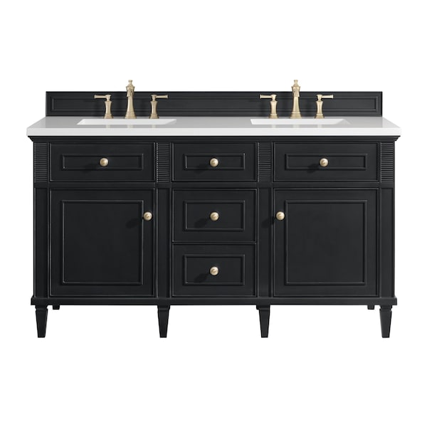The 60'' Lorelai Double Vanity celebrates timeless form and exquisite finish details, combined with practical function. The rich Black Onyx finish is accented by coin-edge knobs in Champagne Brass which provides an sophisticated contrast. Reeded details, and clean, and raised picture frame molding lend visual interest. This two-door cabinet opens to a spacious interior with shelves and convenient USB/Electric power outlets. Three traditional drawers and two tip-outs offer additional storage space. Choose one of our tops with undermount, rectangular sinks to perfectly complete this masterpiece.