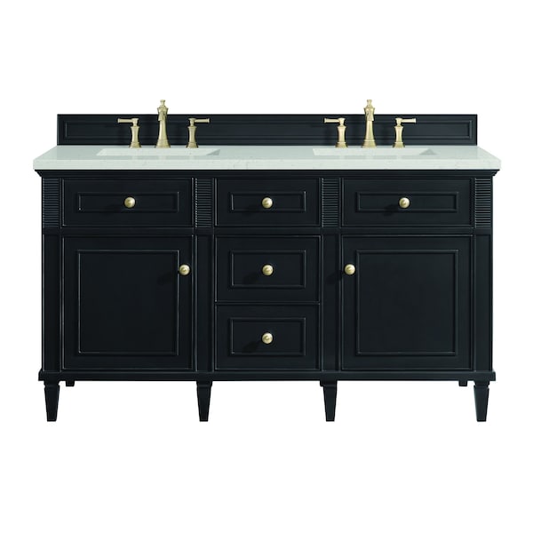 The 60'' Lorelai Double Vanity celebrates timeless form and exquisite finish details, combined with practical function. The rich Black Onyx finish is accented by coin-edge knobs in Champagne Brass which provides an sophisticated contrast. Reeded details, and clean, and raised picture frame molding lend visual interest. This two-door cabinet opens to a spacious interior with shelves and convenient USB/Electric power outlets. Three traditional drawers and two tip-outs offer additional storage space. The Lime Delight Quartz top lends warm, textured beige tones to perfectly complement the dark finish on the vanity.