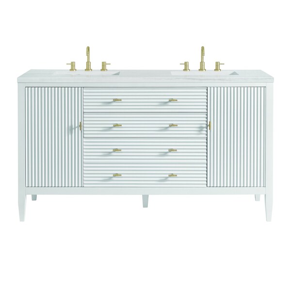 The 60'' Myrrin Double Vanity features a minimalistic silhouette with fluted details, resulting in a blend of classical elegance and contemporary design. The deeply fluted panels run perpendicular on the doors and drawers, adding sophistication and visual interest to the design. Toggle-style knobs in Champagne Brass provide a luxe accent to the rich Bright White finish. The two-door cabinet opens to a spacious interior with a single shelf and a convenient USB/Electric power outlet. Two traditional drawers and a tip-out lend additional storage. Completing this beautiful vanity is a 3 cm solid surface Arctic Fall vanity top, which displays horizontal grey veining, giving you the look of classic marble with the benefits of modern technology.