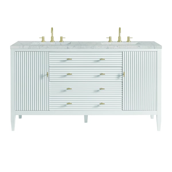 The 60'' Myrrin Double Vanity features a minimalistic silhouette with fluted details, resulting in a blend of classical elegance and contemporary design. The deeply fluted panels run perpendicular on the doors and drawers, adding sophistication and visual interest to the design. Toggle-style knobs in Champagne Brass provide a luxe accent to the rich Bright White finish. The two-door cabinet opens to a spacious interior with a single shelf and a convenient USB/Electric power outlet. Two traditional drawers and a tip-out lend additional storage. Completing the look is the Eternal Jasmine Pearl quartz top by Silestone, featuring an elegant white background with subtle marbleized swirls and dark blue-gray veining patterns.