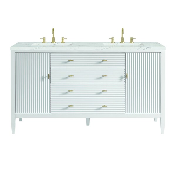 The 60'' Myrrin Double Vanity features a minimalistic silhouette with fluted details, resulting in a blend of classical elegance and contemporary design. The deeply fluted panels run perpendicular on the doors and drawers, adding sophistication and visual interest to the design. Toggle-style knobs in Champagne Brass provide a luxe accent to the rich Bright White finish. The two-door cabinet opens to a spacious interior with a single shelf and a convenient USB/Electric power outlet. Two traditional drawers and a tip-out lend additional storage. The addition of an Ethereal Noctis quartz top by Silestone with undermount rectangular sink completes this timeless bathroom centerpiece with its modern, intricate black and gray nuances which add contrast and elegance to the white background.