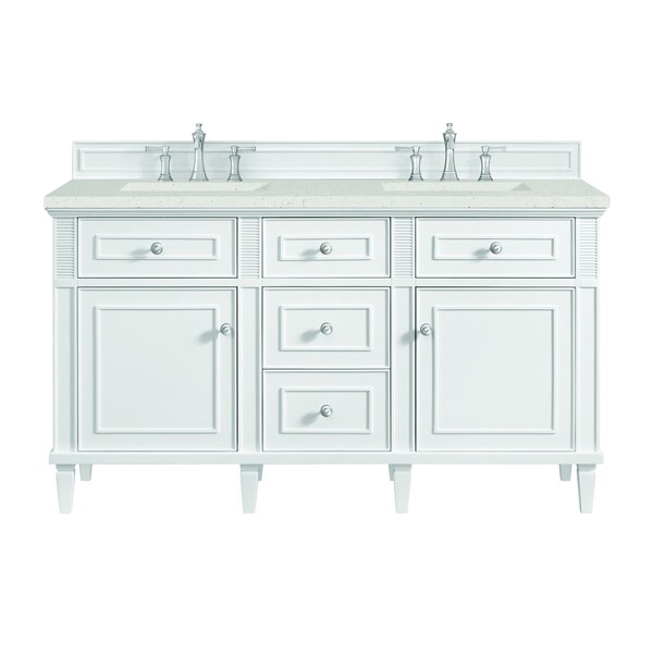 The 60'' Lorelai Double Vanity celebrates timeless form and exquisite finish details, combined with practical function. The sophisticated Bright White finish is accented by reeded details, and clean, raised picture frame molding. Coin-edge knobs in Satin Nickel provide the perfect accent. This two-door cabinet opens to a spacious interior with shelves and convenient USB/Electric power outlets. Three traditional drawers and two tip-outs offer additional storage space. The Lime Delight Quartz top lends warm, textured beige tones to perfectly complement the finish on the vanity.