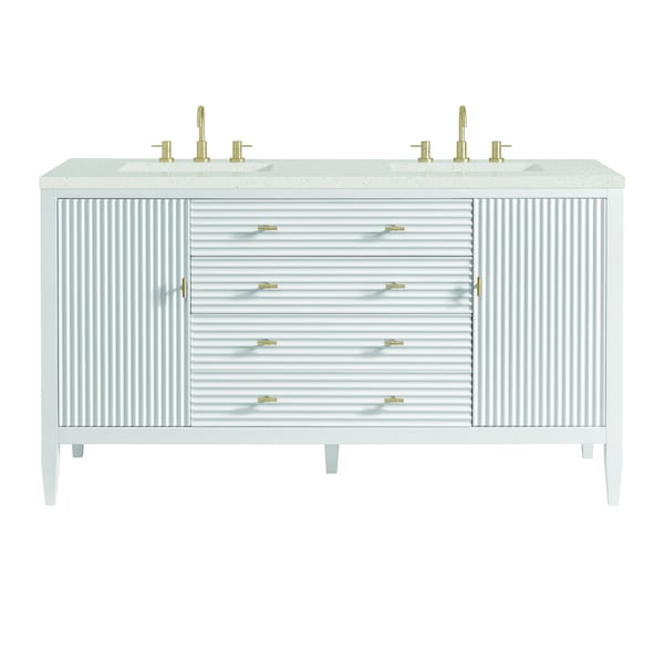 The 60'' Myrrin Double Vanity features a minimalistic silhouette with fluted details, resulting in a blend of classical elegance and contemporary design. The deeply fluted panels run perpendicular on the doors and drawers, adding sophistication and visual interest to the design. Toggle-style knobs in Champagne Brass provide a luxe accent to the rich Bright White finish. The two-door cabinet opens to a spacious interior with a single shelf and a convenient USB/Electric power outlet. Two traditional drawers and a tip-out lend additional storage. The Lime Delight Quartz top lends warm, textured beige tones to perfectly complement the finish on the vanity.