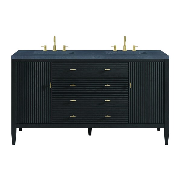 The 60'' Myrrin Double Vanity features a minimalistic silhouette with fluted details, resulting in a blend of classical elegance and contemporary design. The deeply fluted panels run perpendicular on the doors and drawers, adding sophistication and visual interest to the design. Toggle-style knobs in Champagne Brass provide a luxe accent to the sophisticated Carbon Oak finish. The two-door cabinet opens to a spacious interior with a single shelf and a convenient USB/Electric power outlet. Two traditional drawers and a tip-out lend additional storage. Completing this piece is a distinguished top, characterized by depth and a sense of movement with a suede finish. The Charcoal Soapstone Quartz top is a timeless statement to complete the look of your vanity.