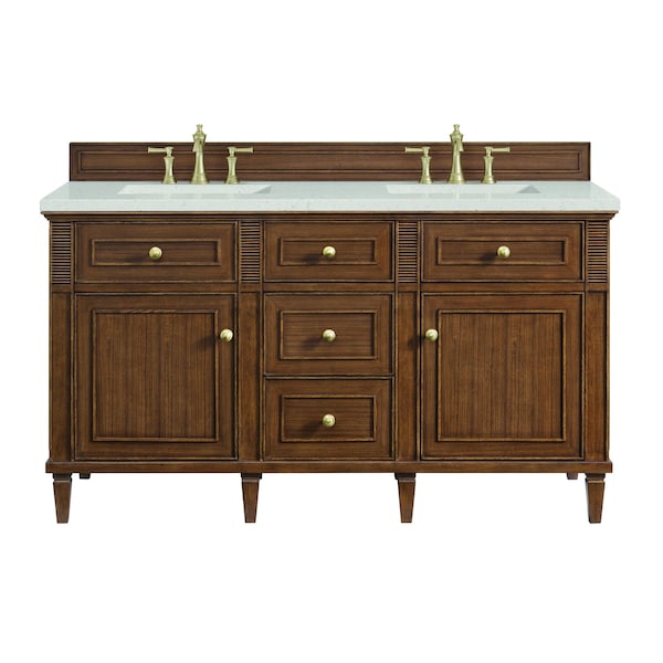 The 60'' Lorelai Double Vanity celebrates timeless form and exquisite finish details, combined with practical function. The beauty of the natural grains in the walnut veneer is accented by reeded details, and clean, raised picture frame molding. The decorative, coin-edge knobs in Champagne Brass provide the perfect complement to the Mid-Century Walnut finish. This two-door cabinet opens to a spacious interior with shelves and convenient USB/Electric power outlets. Three traditional drawers and two tip-outs offer additional storage space. The Lime Delight Quartz top lends warm, textured beige tones to perfectly complement the rich finish on the vanity.