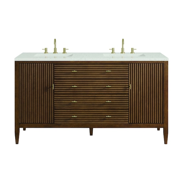 The 60'' Myrrin Double Vanity features a minimalistic silhouette with fluted details, resulting in a blend of classical elegance and contemporary design. The deeply fluted panels run perpendicular on the doors and drawers, adding sophistication and visual interest to the design. Toggle-style knobs in Champagne Brass provide a luxe accent to the rich Mid-Century Walnut finish. The two-door cabinet opens to a spacious interior with a single shelf and a convenient USB/Electric power outlet. Two traditional drawers and a tip-out lend additional storage. The Lime Delight Quartz top lends warm, textured beige tones to perfectly complement the finish on the vanity. The Lime Delight Quartz top lends warm, textured beige tones to perfectly complement the finish on the vanity.