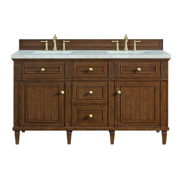 The 60'' Lorelai Double Vanity celebrates timeless form and exquisite finish details, combined with practical function. The beauty of the natural grains in the walnut veneer is accented by reeded details, and clean, raised picture frame molding. The decorative, coin-edge knobs in Champagne Brass provide the perfect complement to the Mid-Century Walnut finish. This two-door cabinet opens to a spacious interior with shelves and convenient USB/Electric power outlets. Three traditional drawers and two tip-outs offer additional storage space. The finish is accented by the neutral background of the Victorian Silver Quartz top, boasting champagne metallic accents which seamlessly complete the look.
