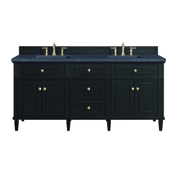 The 72'' Lorelai Double Vanity celebrates timeless form and exquisite finish details, combined with practical function. The rich Black Onyx finish is accented by coin-edge knobs in Champagne Brass which provides an sophisticated contrast. Reeded details, and clean, and raised picture frame molding lend visual interest. This four-door cabinet opens to spacious interior with shelves and convenient USB/Electric power outlets. Three traditional drawers and two tip-outs offer additional storage space. Completing this piece is a distinguished top, characterized by depth and a sense of movement with a suede finish. The Charcoal Soapstone Quartz top is a timeless statement to complete the look of your vanity.
