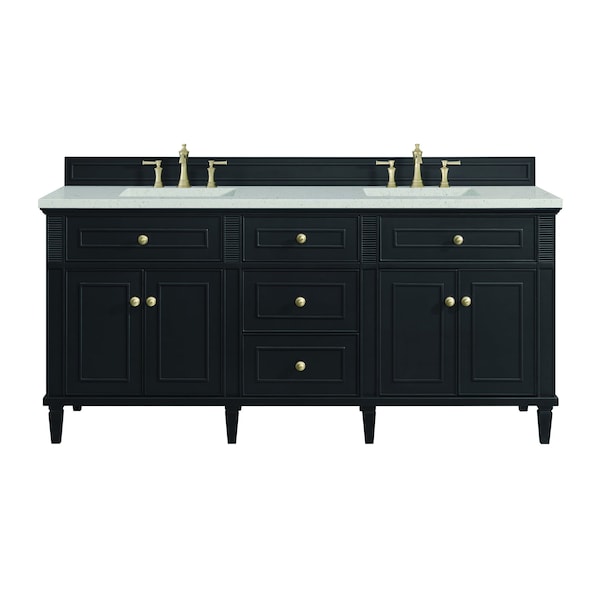 The 72'' Lorelai Double Vanity celebrates timeless form and exquisite finish details, combined with practical function. The rich Black Onyx finish is accented by coin-edge knobs in Champagne Brass which provides an sophisticated contrast. Reeded details, and clean, and raised picture frame molding lend visual interest. This four-door cabinet opens to spacious interior with shelves and convenient USB/Electric power outlets. 3 traditional drawers and 2 tip-out The Lime Delight Quartz top lends warm, textured beige tones to perfectly complement the dark finish on the vanity.