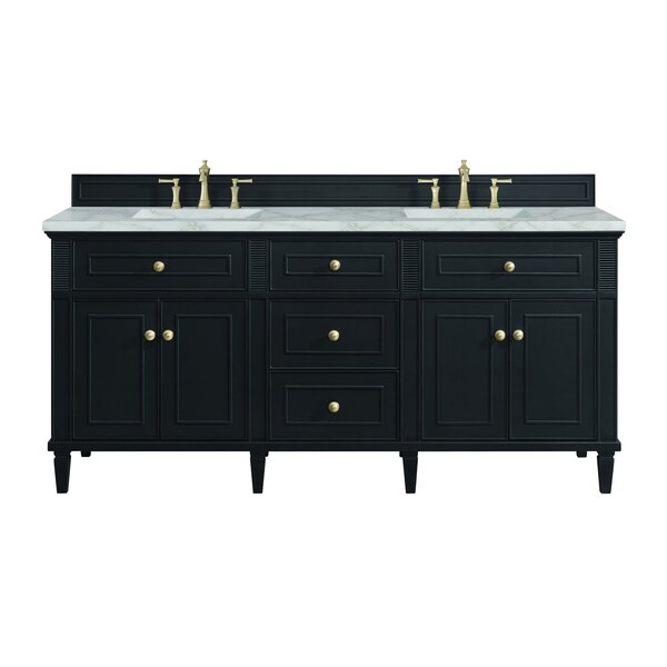 The 72'' Lorelai Double Vanity celebrates timeless form and exquisite finish details, combined with practical function. The rich Black Onyx finish is accented by coin-edge knobs in Champagne Brass which provides an sophisticated contrast. Reeded details, and clean, and raised picture frame molding lend visual interest. This four-door cabinet opens to spacious interior with shelves and convenient USB/Electric power outlets. Three traditional drawers and two tip-outs offer additional storage space. The finish is accented by the neutral background of the Victorian Silver Quartz top, boasting champagne metallic accents which seamlessly complete the look.