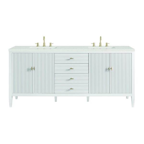 The 72'' Myrrin Double Vanity features a minimalistic silhouette with fluted details, resulting in a blend of classical elegance and contemporary design. The deeply fluted panels run perpendicular on the doors and drawers, adding sophistication and visual interest to the design. Toggle-style knobs in Champagne Brass provide a luxe accent to the rich Bright White finish. The four-door cabinet opens to a spacious interior with a single shelf and convenient USB/Electric power outlets. Three drawers lend additional storage. The Lime Delight Quartz top lends warm, textured beige tones to perfectly complement the finish on the vanity.
