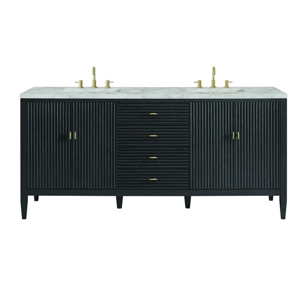 The 72'' Myrrin Double Vanity features a minimalistic silhouette with fluted details, resulting in a blend of classical elegance and contemporary design. The deeply fluted panels run perpendicular on the doors and drawers, adding sophistication and visual interest to the design. Toggle-style knobs in Champagne Brass provide a luxe accent to the sophisticated Carbon Oak finish. The four-door cabinet opens to a spacious interior with a single shelf and convenient USB/Electric power outlets. Three drawers lend additional storage. The finish is accented by the neutral background of the Victorian Silver Quartz top, boasting champagne metallic accents which seamlessly complete the look.