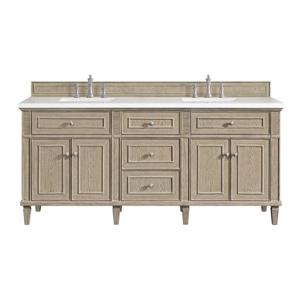 The 72'' Lorelai Double Vanity celebrates timeless form and exquisite finish details, combined with practical function. The Whitewashed Oak finish is accented by reeded details, and clean, raised picture frame molding. Coin-edge knobs in Satin Nickel provide the perfect accent. This four-door cabinet opens to spacious interior with shelves and convenient USB/Electric power outlets. Three traditional drawers and two tip-outs offer additional storage space. With the addition of a classic White Zeus Silestone top and undermount sink, this vanity is a seamless integration of modern design and functionality.
