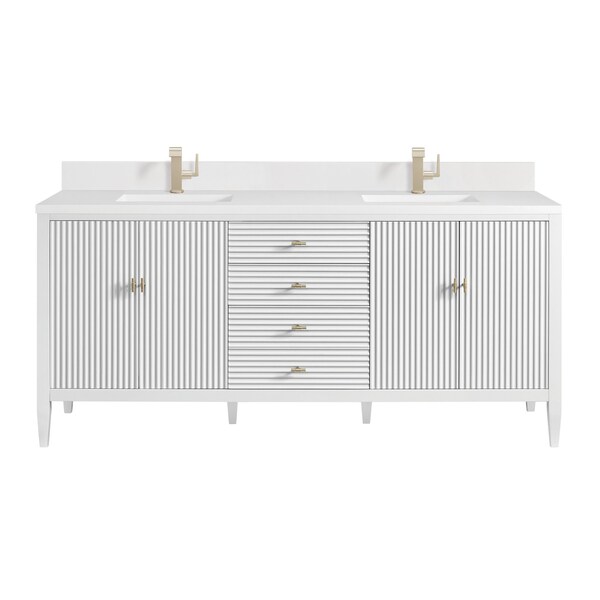 The 72" Myrrin Double Vanity features a minimalistic silhouette with fluted details, resulting in a blend of classical elegance and contemporary design. The deeply fluted panels run perpendicular on the doors and drawers, adding sophistication and visual interest to the design. Toggle-style knobs in Champagne Brass provide a luxe accent to the rich Bright White finish. The four-door cabinet opens to a spacious interior with a single shelf and convenient USB/Electric power outlets. Three drawers lend additional storage. With the addition of a classic White Zeus Silestone top with backsplash and undermount sink, this vanity is a seamless integration of modern design and functionality.