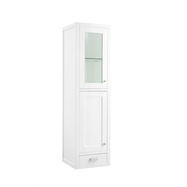 The Addison 15in Glossy White Petite Tower Hutch, Left by James Martin Vanities gives you a fresh take on Shaker-inspired design with a look of luxury. Handcrafted and gender-neutral, it fits effortlessly into modern or transitional rooms. This versatile tower shows off its elegant style with its beautifully open glass top area for which you can use for storage or display purposes. The Shaker touch comes from the sides and door. Each of the doors feature soft-close door hinges, these hinges have dual adjustments up and down, forward and backward to allow for alignment adjustments after the cabinet has been installed. The body of the cabinet is made of solid hardwood and sturdy panels of MDF. Interior shelves are both adjustable and removable. Each shelf is made from thick multi-layered plywood faced with stain-grade yellow poplar veneers. The cabinet interior and exterior is sealed with a moisture and UV resistant finish.