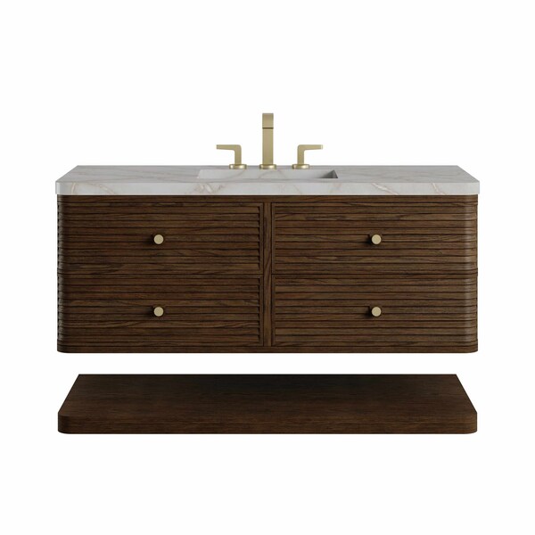 Distinguished by a louvered facade and gently curved profile, the Allamari collection pairs architectural precision with modern invention. The wood louvers are created using solid Ash wood with a rich wire-brushed texture. Sleek, beveled brass knobs highlighted by wood back plates provide a graphic focal point and play against the vanity's curved wraparound edges. Mounted above an LED-lit shelf, the vanity's floating effect and curved, naval-inspired architecture bring a sense of calm to a space - elevating everyday routines into moments of personal serenity.