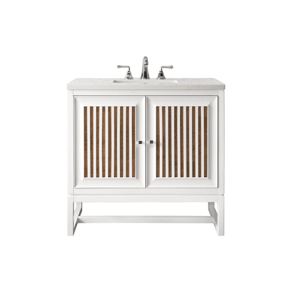 Bring a bit of the Greek Island home with the Athens 30 Glossy White Single Vanity by James Martin Vanities. Part of the larger Athens modular collection, this incredible Vanity boasts an impressive amount of storage space and combines traditional charm with modern functionality. Premium standard features include soft-close undermount drawer glides and adjustable door hinges, a brushed aluminum laminate drawer bottom, and one bamboo drawer organizer. The look is completed with a 3 CM eased edge Carrara Marble top and one white ceramic rectangular sink.