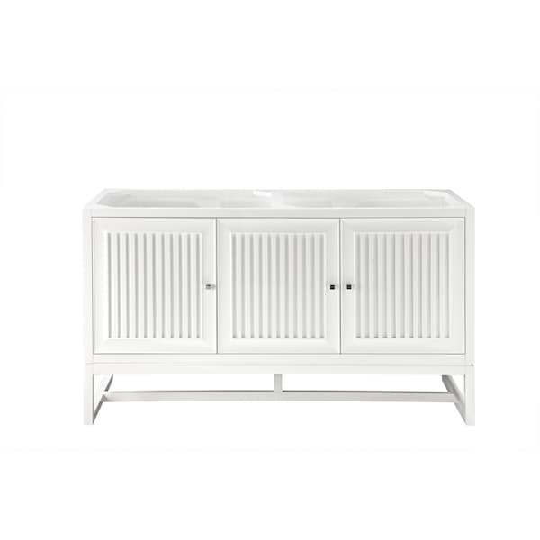Bring a bit of the Greek Island home with the Athens 60in Glossy White Double Vanity Cabinet by James Martin Vanities. Part of the larger Athens modular collection, this incredible vanity cabinet boasts an impressive amount of storage space and combines traditional charm with modern functionality. Premium standard features include soft-close undermount drawer glides and adjustable door hinges, brushed aluminum laminate drawer bottoms, and one bamboo drawer organizer. Please note, this is the vanity cabinet only- a countertop is not included with this cabinet.