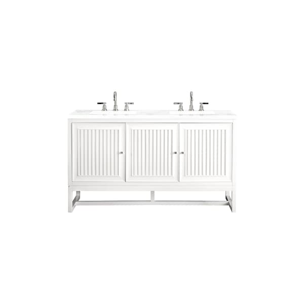 Bring a bit of the Greek Island home with the Athens 60in Glossy White Double Vanity by James Martin Vanities. Part of the larger Athens modular collection, this incredible Vanity boasts an impressive amount of storage space and combines traditional charm with modern functionality. Premium standard features include soft-close undermount drawer glides and adjustable door hinges, brushed aluminum laminate drawer bottoms, and one bamboo drawer organizer. The look is completed with a 3 CM eased edge Arctic Fall Solid Surface top and two white ceramic rectangular sinks.