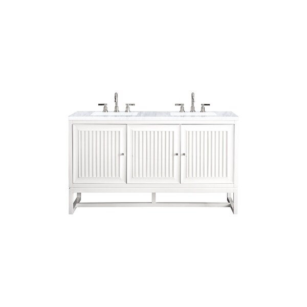 Bring a bit of the Greek Island home with the Athens 60 Glossy White Double Vanity by James Martin Vanities. Part of the larger Athens modular collection, this incredible Vanity boasts an impressive amount of storage space and combines traditional charm with modern functionality. Premium standard features include soft-close undermount drawer glides and adjustable door hinges, brushed aluminum laminate drawer bottoms, and one bamboo drawer organizer. The look is completed with a 3 CM eased edge Carrara Marble top and two white ceramic rectangular sinks.