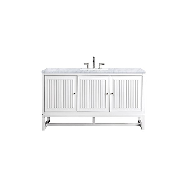 Bring a bit of the Greek Island home with the Athens 60 Glossy White Single Vanity by James Martin Vanities. Part of the larger Athens modular collection, this incredible Vanity boasts an impressive amount of storage space and combines traditional charm with modern functionality. Premium standard features include soft-close undermount drawer glides and adjustable door hinges, brushed aluminum laminate drawer bottoms, and one bamboo drawer organizer. The look is completed with a 3 CM eased edge Carrara Marble top and one white ceramic rectangular sink.