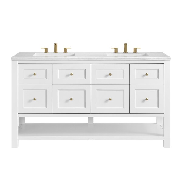 The Breckenridge 60 in. Double Vanity is a fresh take on traditional Mission furniture that easily transitions to Modern Farmhouse style with an air of understated sophistication. Champagne Brass knobs complement the Bright White finish, while the neatly inset door and drawer fronts lend a fresh appeal to this clean-lined classic. Two single-door cabinets open to reveal interior shelves equipped with a convenient built-in USB/120V power outlet. This console-style vanity also features two top-row tip-out drawers, two standard full-extension drawers, and an open lower shelf for additional storage. A modern Arctic Fall Solid Surface top with undermount sinks completes the look.