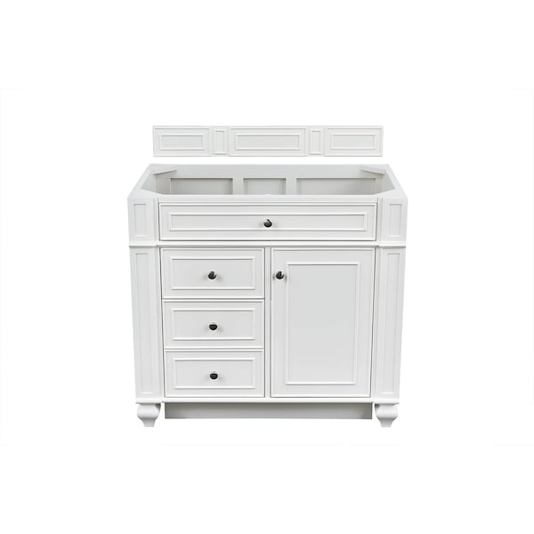 The Bristol 36in Bright White Single Vanity Cabinet features a full plinth base, also known as a toe kick or pedestal base, This wraparound base allows for quick clean ups. This vanity is complimented by Satin Nickel door and drawer pulls, along with an optional wood backsplash.