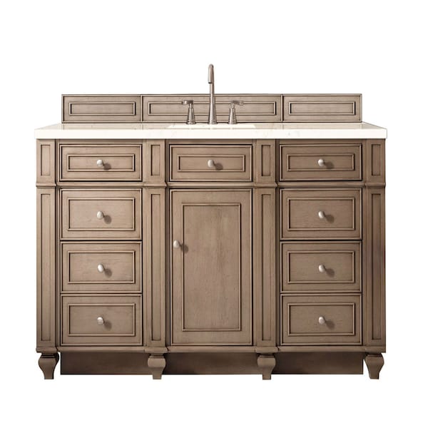 The Bristol 60in Whitewashed Walnut Single Vanity features a full plinth base, also known as a toe kick or pedestal base. This wraparound base allows for quick clean ups. This vanity is complimented by Satin Nickel door and drawer pulls, along with an optional wood backsplash. The look is completed with a 3 CM eased edge Eternal Marfil Silestone Quartz top and one white ceramic rectangular sink.