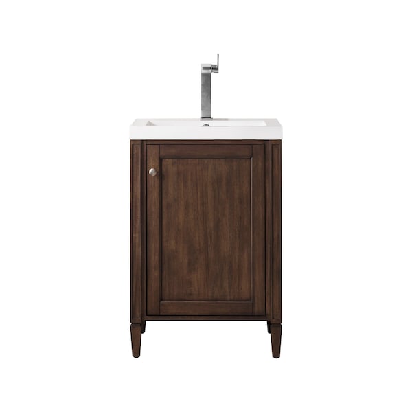 The streamlined structure of the Britannia 24in Single Vanity by James Martin Vanities has a visually elegant appearance. This beautiful cabinet is constructed with poplar solids and veneers featuring a Mid-Century Acacia finish, and the gorgeous White Glossy Composite Stone top is durable enough to handle daily usage. It has one full size door that conceals a spacious storage area. Small and demure, this vanity has an uncomplicated silhouette that will bring a quiet elegance to any bathroom.