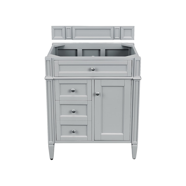 The Brittany 30in Urban Gray Single Vanity by James Martin Vanities features classic details that bridge both traditional and transitional styles. This beautiful piece of furniture includes one hide-away tip-out, top row drawer plus two full-depth side drawers, one of which is double-height for storage of taller items.This cabinet also has one door, which conceals an interior shelf, for ample storage, and a bamboo drawer organizer.Hand crafted in yellow poplar solids and yellow poplar veneers with Satin Nickel hardware. Matching wood backsplash is included.
