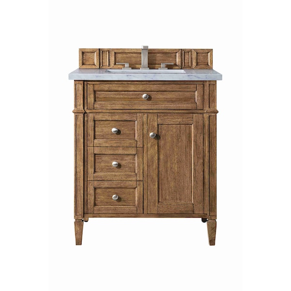 The Brittany 30in Saddle Brown Single Vanity by James Martin Vanities features classic details that bridge both traditional and transitional styles. This beautiful piece of furniture includes one hide-away tip-out, top row drawer plus two full-depth side drawers, one of which is double-height for storage of taller items. This cabinet also has one door, which conceals an interior shelf for ample storage, and a bamboo drawer organizer.Hand crafted in yellow poplar solids and yellow poplar veneers with Satin Nickel hardware. Matching wood backsplash is included. The look is completed with a 3 CM eased edge Arctic Fall Solid Surface top with one white ceramic rectangular sink.