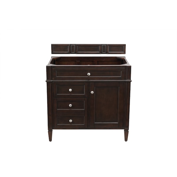 The Brittany 36in Burnished Mahogany Single Vanity by James Martin Vanities features classic details that bridge both traditional and transitional styles. This beautiful piece of furniture includes one hide-away tip-out, top row drawer plus two full-depth side drawers, one of which is double-height for storage of taller items.This cabinet also has one door, which conceals an interior shelf, for ample storage. Hand crafted in yellow poplar solids and yellow poplar veneers with Satin Nickel hardware. Matching wood backsplash is included.