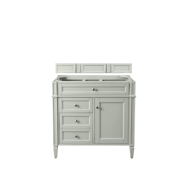 The Brittany 36in Sage Green Single Vanity by James Martin Vanities features classic details that bridge both traditional and transitional styles. This beautiful piece of furniture includes one hide-away tip-out, top row drawer plus two full-depth side drawers, one of which is double-height for storage of taller items.This cabinet also has one door, which conceals an interior shelf, for ample storage.Hand crafted in yellow poplar solids and yellow poplar veneers with Satin Nickel hardware. Matching wood backsplash is included.